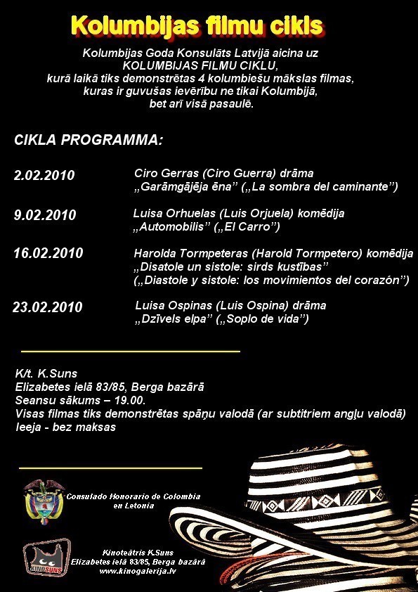 Kolumbijas Republikas Goda konsulāts Latvijā aicina uz Kolumbijas filmu nedēļu, kas norisināsies 2010.gada februārī k/t K.Suns (Elizabetes ielā 83/85)
